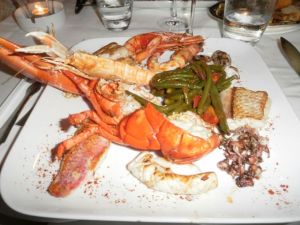 For entree we shared a dish of seared scallops on a bed of broccoli and foi gras puree. It was lovely. We didn’t go for primi, as it was all pasta (I do seriously wonder how anyone can change 30-40E for a plate of pasta, no matter how good. Would they have charged the same if they’d had GF pasta, which is 2E a packet??) For mains, I chose the mixed grilled seafood from the Tyrrhenian Sea, which turned out to be a huge plate of assorted seafood, like half a lobster, a huge scampi (yabby/megaprawn), two fillets of fish (trout or salmon, and a white fish), baby octopus, squid, and what looked like foetal octopi – these things were less than a cm long from top to end of tentacle! Wow! This was accompanied by sauteed beans and a salad. Pretty much worth the 50E!