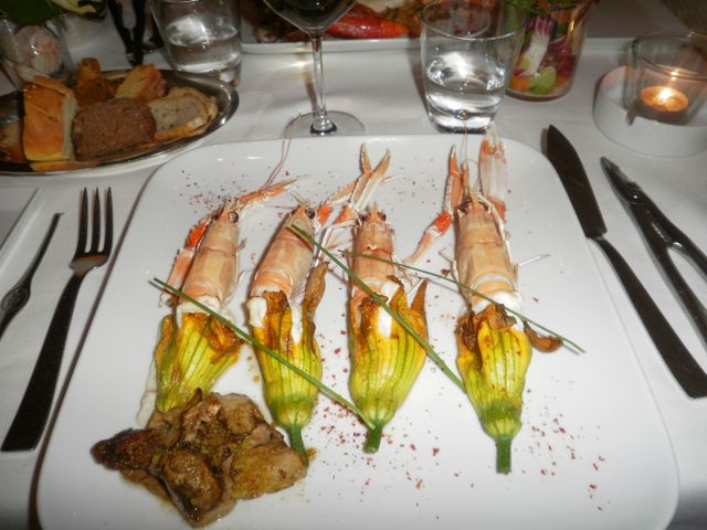 R had an amazing-looking dish of the megaprawn scampi peeking out from zucchini flowers. The tail meat had been diced and cooked with a creamy cheesy sauce, then put back together with the head in the flowers. Looked great, but wasn’t quite as filling as my plate.