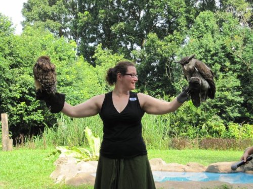 We watched the Birds of Prey show, and I was agitating that they only asked the kids to volunteer to hold the birds… until they asked for an adult volunteer! My chance at fame (and holding big scary birds) had come! I was gloved up, and brought out a gorgeous big hawk owl. Then another bird flew out and landed on my other arm! Wow!