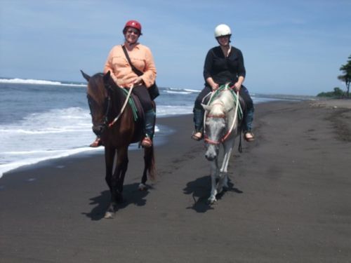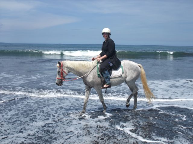 Then we were taken to the horse-riding place, where we hopped aboard a pair of very tired horses who had obviously been schlepping tourists along the beach all day. I felt really sorry for my horse, Tootie, who, as you can see in the pictures (all taken at the beginning of the ride!) was reeeeeaaaally tired. We managed to make it along the beach and back okay though, even though Tootie was stumbling a bit by the time we got back. The guide managed to coax Tootie into a bone-jarring trot for a few seconds, but he was so tired that we stopped really quickly. So much for my dreams of cantering along the beach through the surf – but I really couldn’t have asked any more of the poor horse.