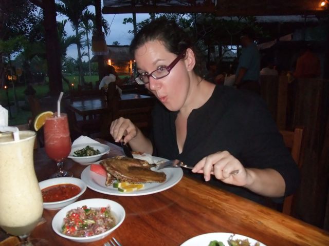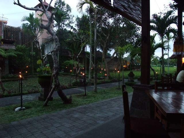 We wandered out onto the main drag to have dinner, stopping at The Dirty Duck, which I’d heard about on Tripadvisor. It’s a gorgeous setting, overlooking the rice fields on the other side of the road as our hotel. Unfortunately their extra special meals you need to order a day in advance, but we had their specialty, Crispy Duck. R would have been amused – we had to eat with our hands, something I don’t do very often! (knife and fork here are just for show)