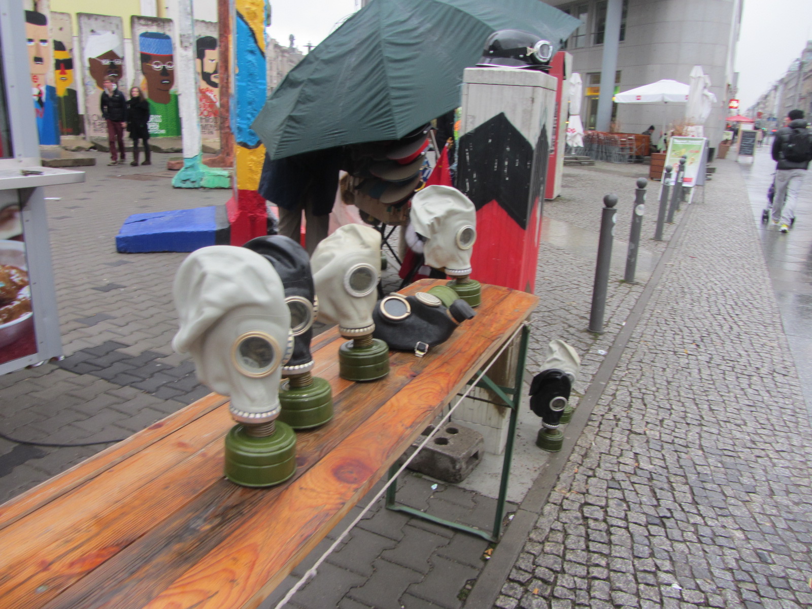 Checkpoint Charlie was the next break stop, which started off with hot chocolates to help us defrost slightly! The wind-chill factor riding a Segway is huge, especially when it’s drizzling, as it was. Checkpoint Charlie has a lot of new displays and information exhibits, as well as the ubiquitous people asking for money for various “causes”. The weirdest thing was some of the souvenirs though – gas mask hats and possibly lamps???