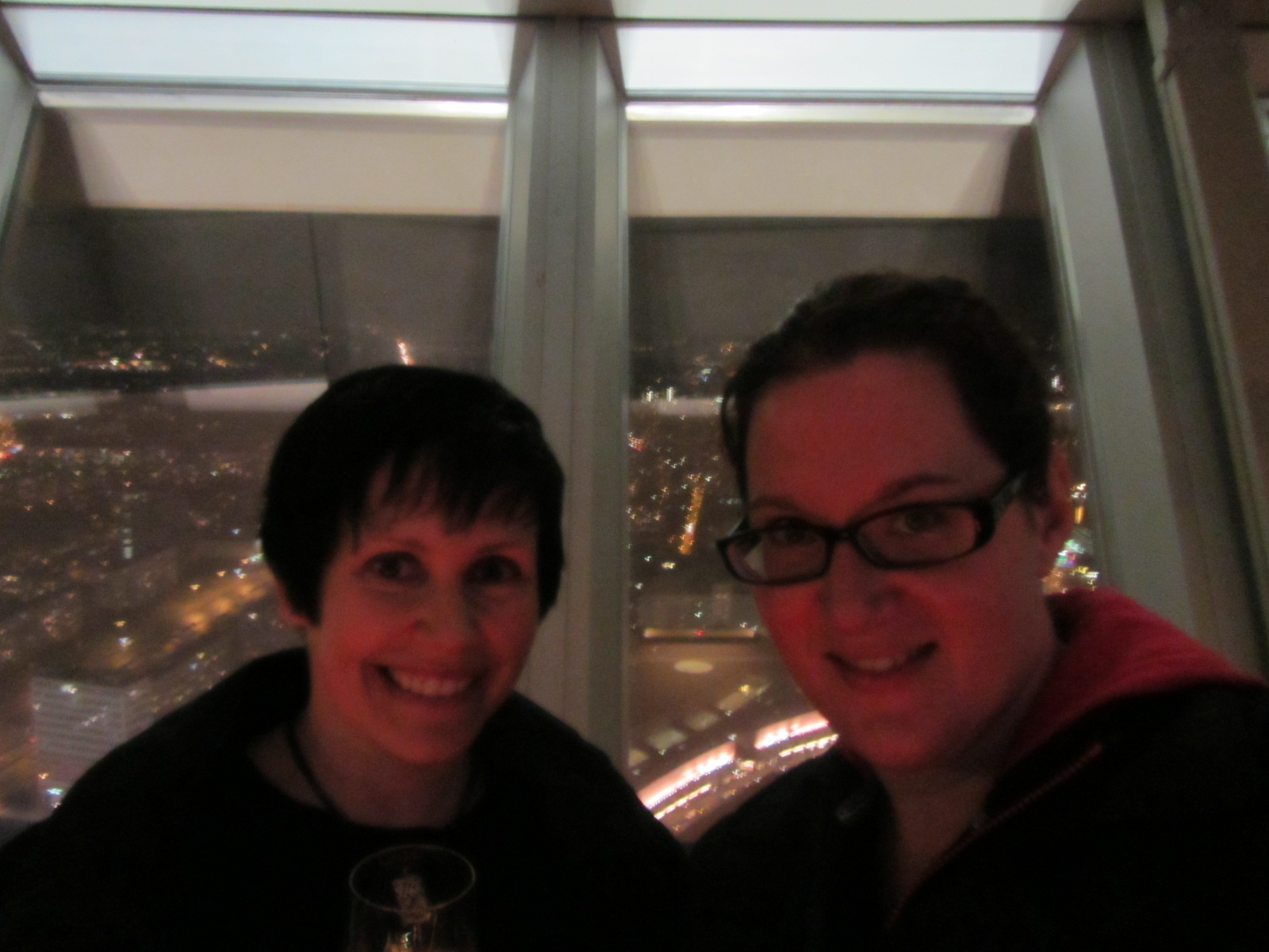 200m into the sky we hopped out of the crowded elevator (was no one else worried about cramming so many people into the lift when we were going so high up? I certainly hope they maintain that lift rigorously!!!!) and into the bulbous bit of the tower, which houses the viewing corridor, bar and restaurant. My fear of heights had a bit of a workout here, as you look down through the bottom part of the bulb out to the city below. Amazing views, but I’m not too crash hot on looking down! Luckily the bar was handy, and after a sparkling wine and a 360 Degrees cocktail, I wash fiiiiiine. D also tried out her first taste of the Currywurst, which she quite enjoyed.