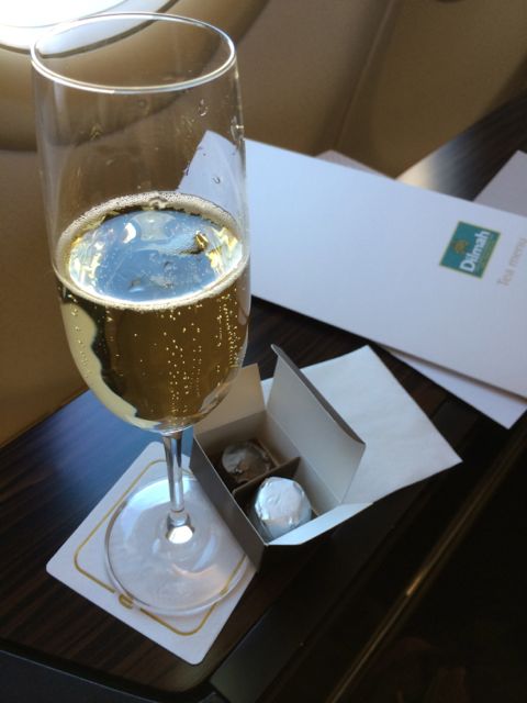 There was a little gift box with two choccies in it to welcome us aboard, and it took about three minutes for our first drink orders to be taken. The bubbly didn’t disappoint – a white and a rose, and both were pretty tasty. We were also given pyjamas and slippers, which were pretty swish!