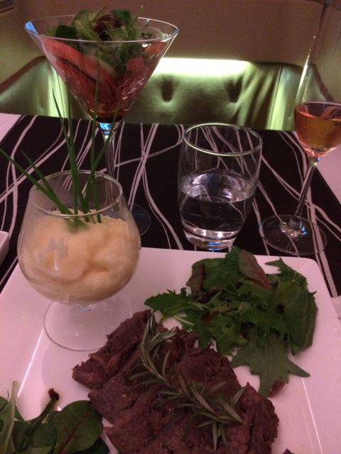 Dinner was the next experience – wow! Our personal chef came around to discuss food with us, and would make dishes on request. I didn’t go that far, but ordered the crusted seared tuna and the special of the day, a lamb dish. There was also an amuse bouche of smoked salmon, asparagus and creme fraiche, then appetiser of Middle Eastern dips. After entree, there was even a palate cleanser of sorbet!