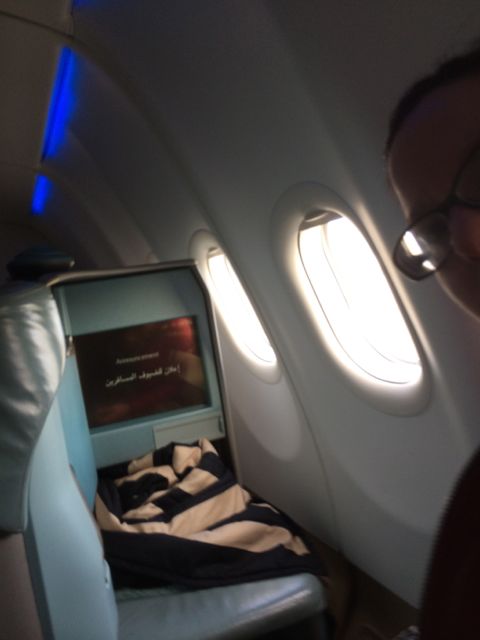 After this dining experience, it was time to don the comfy pyjamas and get some shut-eye. Unfortunately at this point, the turbulence started… and kept up for most of the 6 hours we still had to go. I have to say, turbulence is still pretty bouncy in the pointy end as well as the rest of the plane! There were a few of us looking a bit green by the time we were nearing Abu Dhabi, and our lovely attendant was very concerned, bringing me ginger ale even though they’d locked everything up for landing.