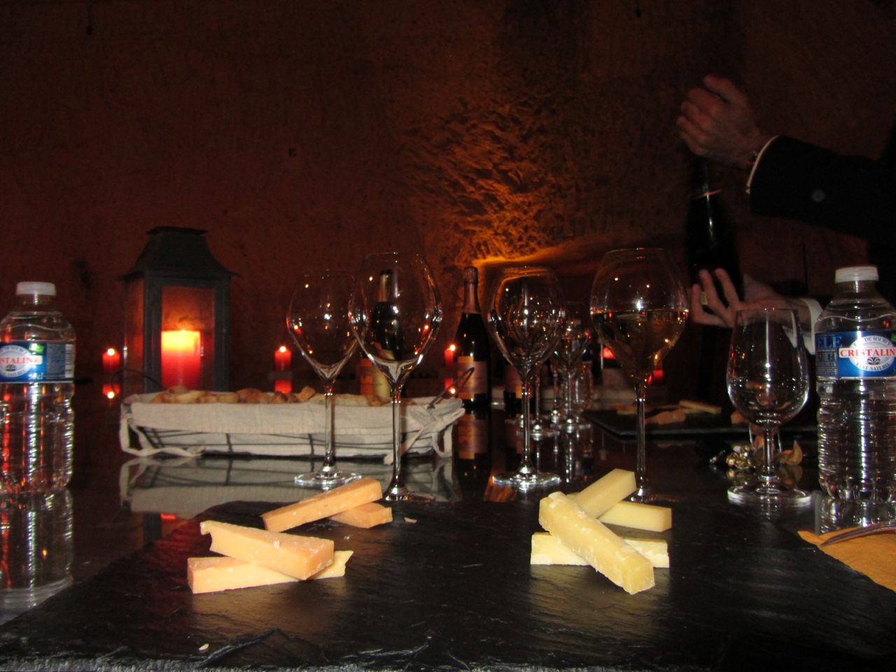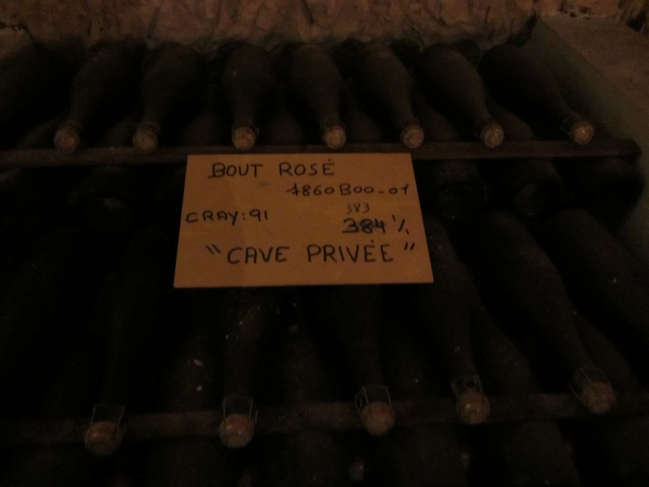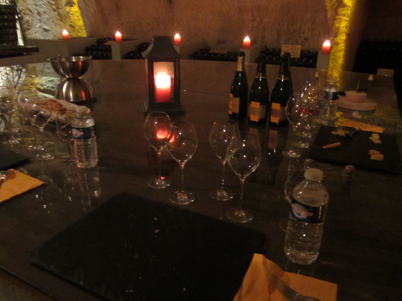 Our tasting was in one of the oenothèques (wine library) where they store small numbers of special vintages. It was candlelit plus a few of the yellow lights they use to avoid the lights spoiling the wine. The table was set with plates of four cheeses, with four glasses, and four bottles of vintage: 2004 privee cave white, 2004 privee cave rose, and the surprises were a 1990 privee cave white and the 1989 rose!