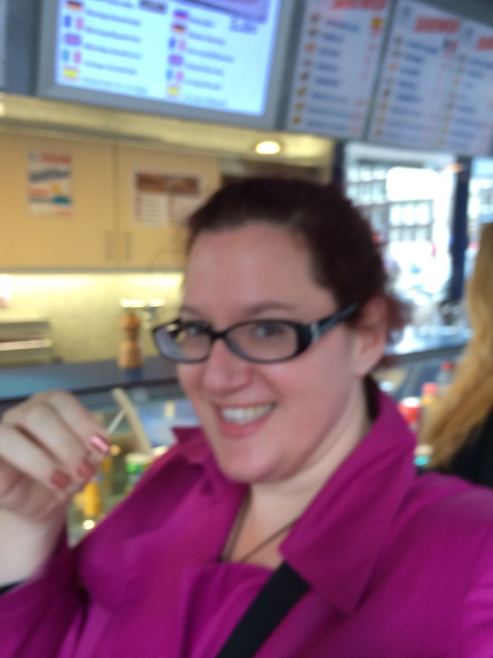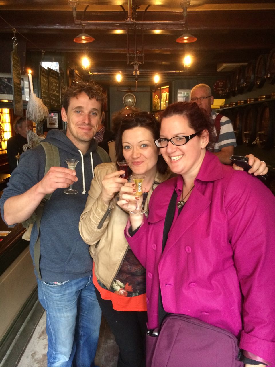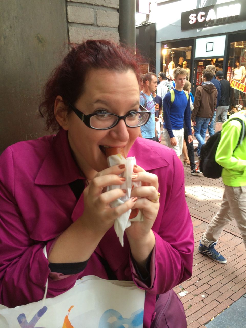 Sean took us around to show us a lot of Dutch traditional food, like cheese (must eat it with mustard or a sauce of some kind to make it truly Dutch), frites in the paper cones (with sauce again), sausages, either in a bun or just naked in a paper bag (with sauce!) brined herring and eel (the eel was great, and the herring okay, but a bit squishy…) and then a tasting of a liqueur. The others tried the little miniature yeasted pancakes too, which were apparently amazing. 🙂