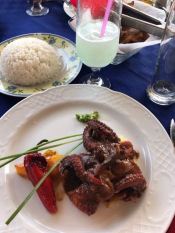 We stopped for lunch at a little place around the corner and up the hill, which was also three levels and provided a wonderful view across the city. I had a delicious octopus with rice and tostones (amazing plantain fritters), while the others had chicken or pork.