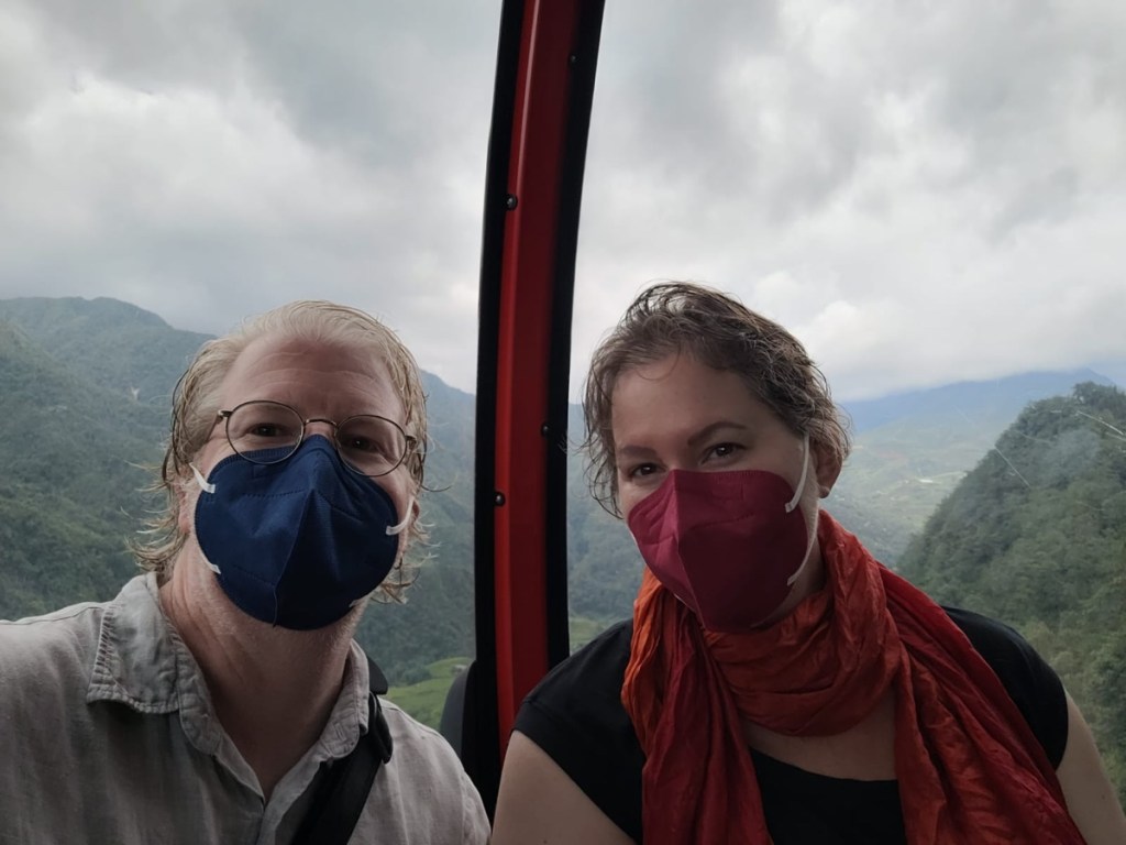 On our last full day in Sapa we finally climbed the mountain! We soon realised that this is where everyone was — there were long queues of tourists everywhere, even in the whipping wind and icy mist, at the peak! We took the “easy” way – a funicular, then a cable car over the spectacular valleys (yes, scary!) and then a final funicular to get us close to the peak. With this help, my fitness app tells me we only had to climb 22 storeys today, to reach 3100m. It’s the only way I’ll ever get this high again!