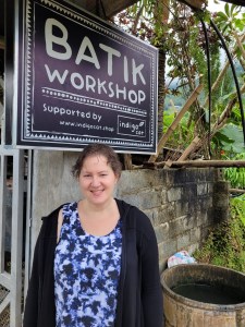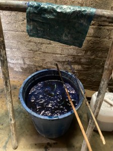 The batik workshop took place in a little village about half an hour from Sapa, and it was arranged by the people at Indigo Cat handcrafts – it’s the proprietors’ mum, Meme I think? who takes the class, at her house. It was just the two of us (if you don’t count the grandkids, the buffalo nosing in for extra breakfast, the various dogs and cats, plus occasional trekkers who were heading past and stuck their heads in to see what was happening, including a Portuguese pair who had been on our bus from Hanoi.)