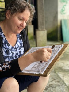 Meme doesn’t speak much English (but much more than we speak Vietnamese) so a lot of the instruction was demonstrate-copy. She showed us some tips with our technique, such as ensuring the tool is in the molten wax for long enough that the tool nib stays hot and the wax liquid, otherwise the wax beads onto the surface of the fabric rather than soaking in to act as a dye inhibitor.