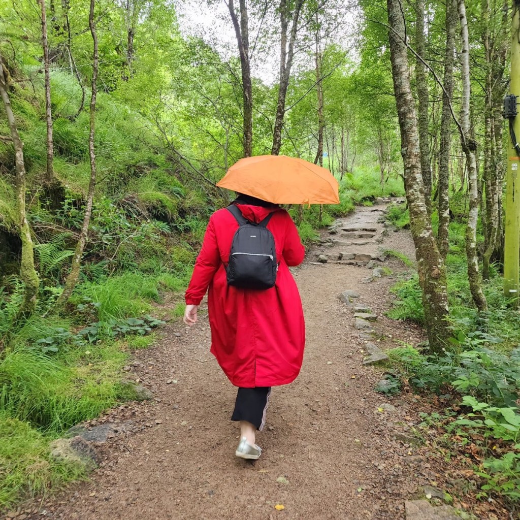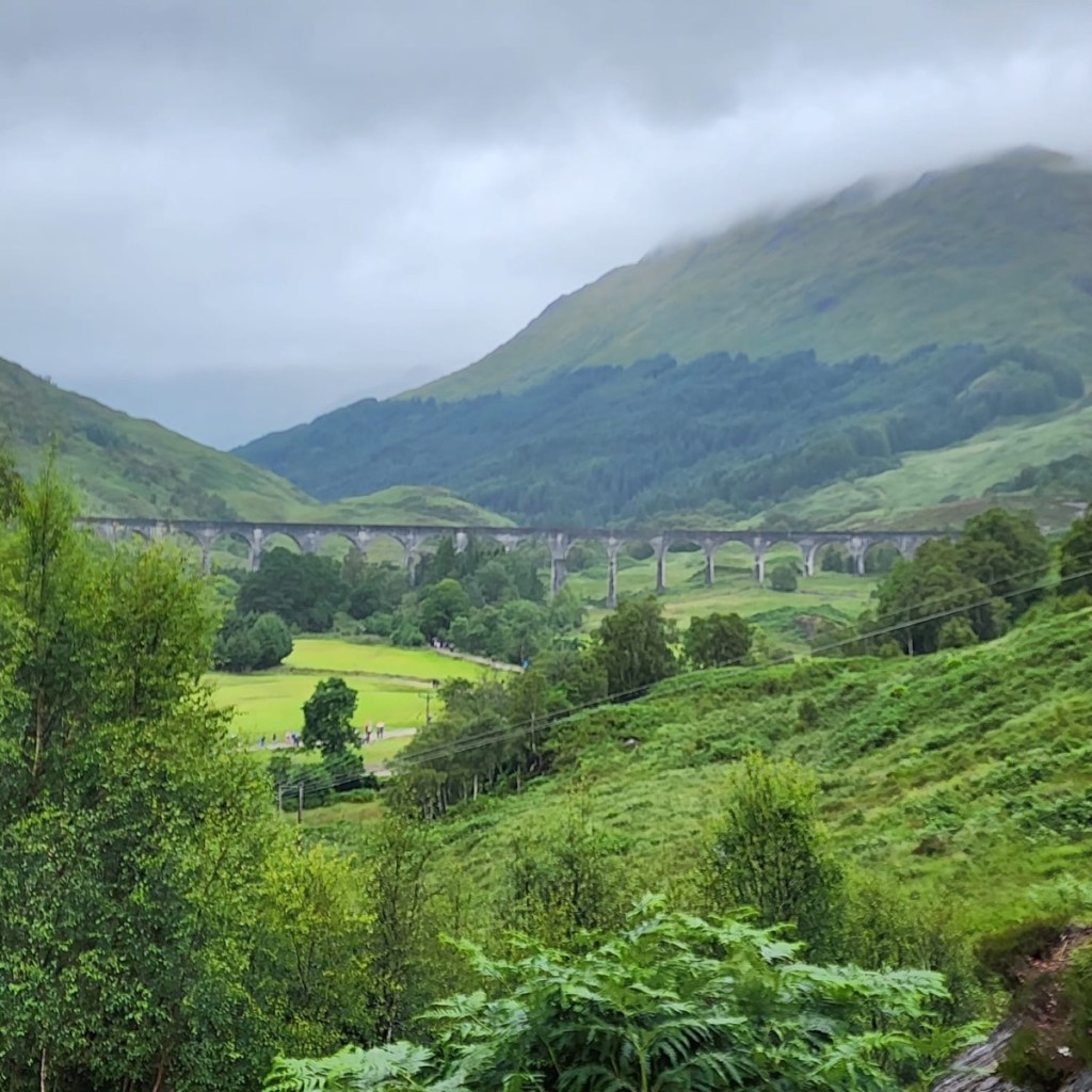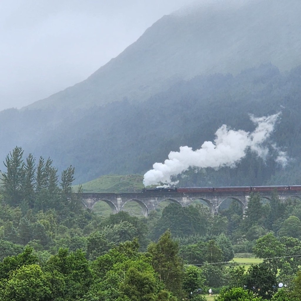 We waved a fond farewell to our castle after two days and headed through the beautiful scenery up to Glenfinnan to see the Viaduct. The roads were single lane with passing places for most of the trip (my ‘favourite’ bit was the single lane clinging to the side of the cliff, with frequent signs warning of falling rocks. But beautiful scenery!)