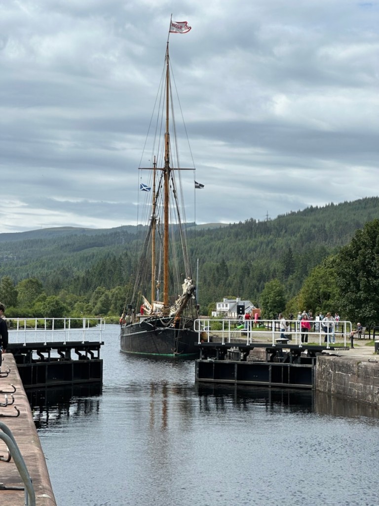 Fort Augustus was teeming with other tourists, as it was a beautiful day. Lots of people were enjoying the weather on the sides of the canal and we were just in time to see a sailing boat heading down the locks. Amazing!