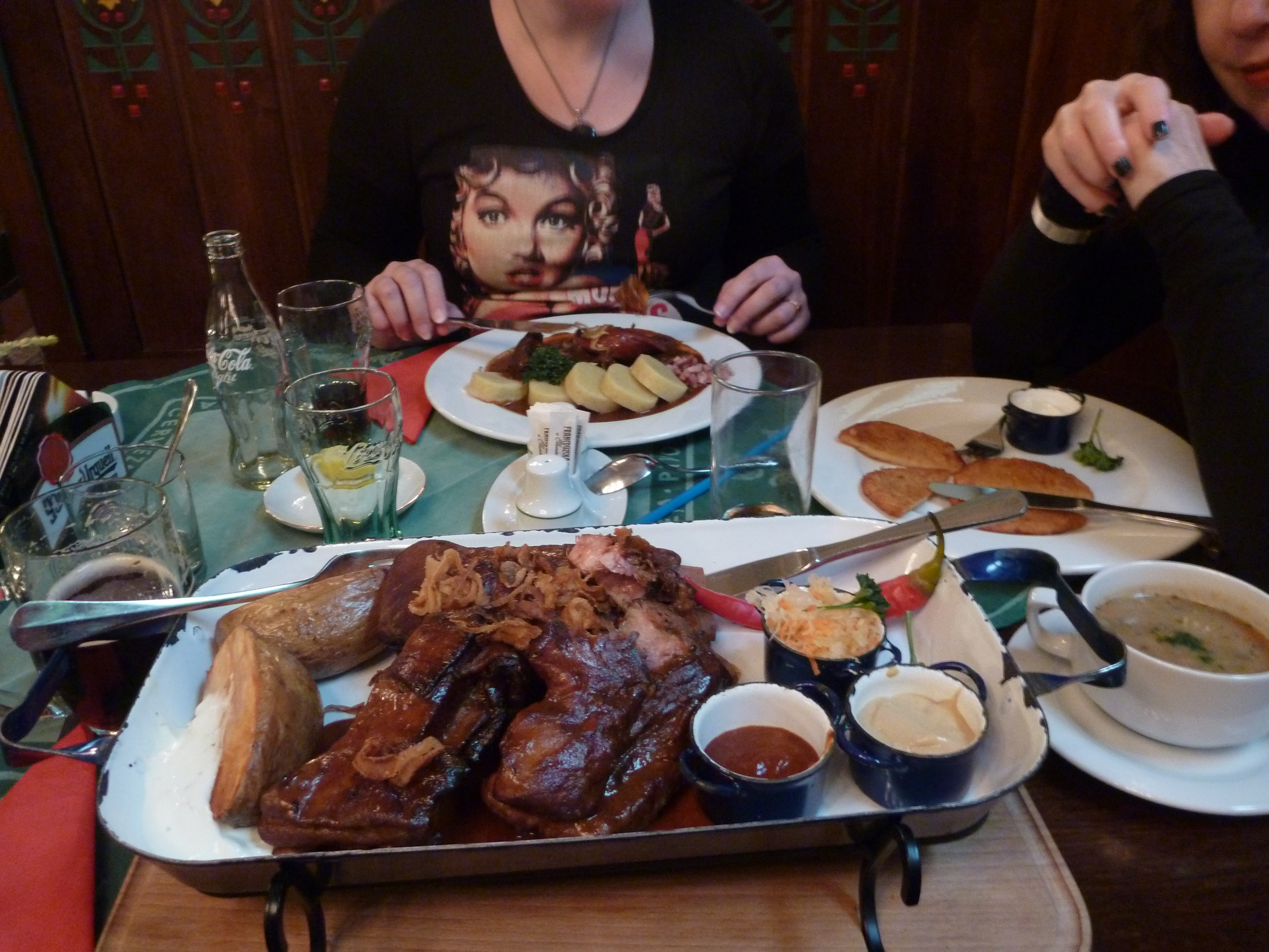 Fortunately or unfortunately, depending on how you look at it, the main museum at the end of Wenceslas Square was closed, which meant we weren’t quite as late as we might have been, getting to lunch with I. We managed to drag her away from work again, and she was going to show us a great place to get traditional Czech food, the Imperial Hotel. Unfortunately it was booked out, so we ended up heading back to Municipal House to try out the “traditional beer pub” in the basement. Gorgeous tile work and great, if a little stodgy, food. I had the goulash and D had another go at Bohemian Ribs, accompanied by Czech “rum” (potato based, apparently, and quite aromatic) and Coke. Nothing like good old Barcardi ‘n’ Coke, I promise! Have it with a drizzle of lemon juice and it’s very tasty.