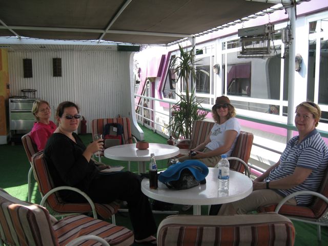 Instead of donkeys, we took a taxi bus back to the banks of the Nile. The drivers were no less competitive than the donkeys, overtaking tour buses on blind corners and making us generally fear that we’d be joining the pharaohs pretty soon! But we made it back and took a ferry across, before moving our stuff to the riverboat for the next few days.
