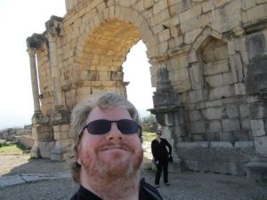 We set out early this morning for another long driving day, which included a stop at the Roman ruins at Volubilis. Here’s both of us in front of (an) Arc de Triomph!