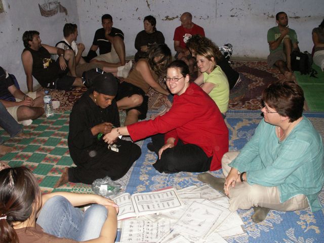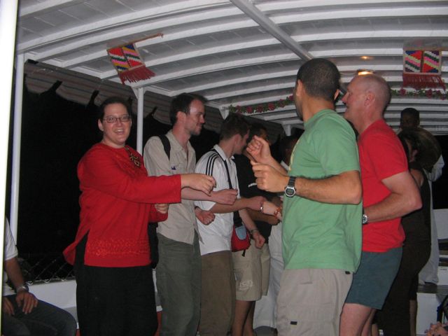 On our ferry trip back, some of the motors had broken down, so the drivers tied the boats together in a convoy and we floated back, dancing to some of the guys accompanying us with tambourines and tablas.