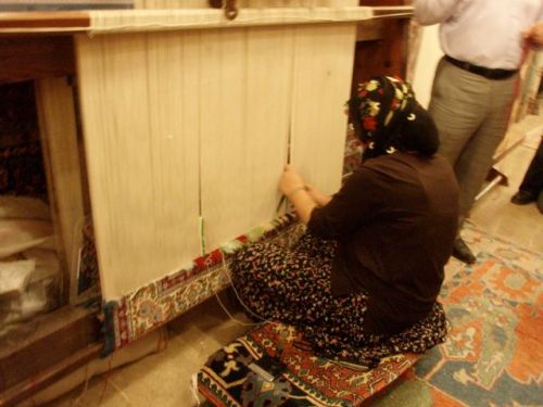 On our way to Pammukale we stopped off at a carpet factory/tourist shop to see how carpets are made. We saw the silk being spun from silkworm cocoons (interesting but kind of gross when the silkworms are boiled to kill them…), carpets being hand knotted, and saw some of the amazing textiles from the area. There were some gorgeous carpets, but I managed to not “accidentally” buy anything. A few of the girls were very tempted!