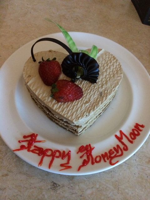 A bit of an indulgent day all round, really – lunch was hanging around in the exec lounge for afternoon tea to start – they have teeny weeny macarons! And then after checking out the hotel pool (warm, but not too warm – the only downside is that you have to walk through the fitness room past all the people doing proper exercise) the hotel sent us a cake to celebrate our honeymoon! Awww…