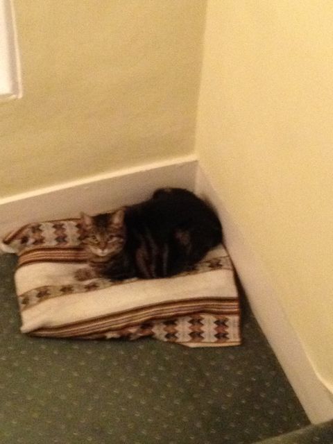 We tried to tiptoe upstairs, but may not have been terribly successful. The hotel cat, who had barely lifted a whisker in greeting earlier, looked up in disgruntlement as we trundled past its sleeping place after dinner.